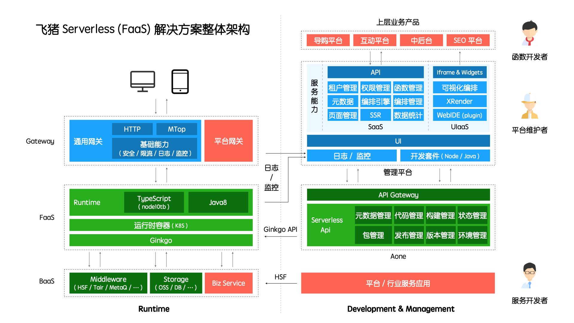 随着 Serverless 在业界各云平台的落地,通过 FaaS 这一种“碎片化”函数方案可以很好解决上述那些很前后端协助碎片化问题;在财年初,在中间件团队做的 Serverless 容器基础建设加上研发部门 FaaS 平台侧、Midway Runtime 支持,让 Serverless 在集团可落地变有可能。