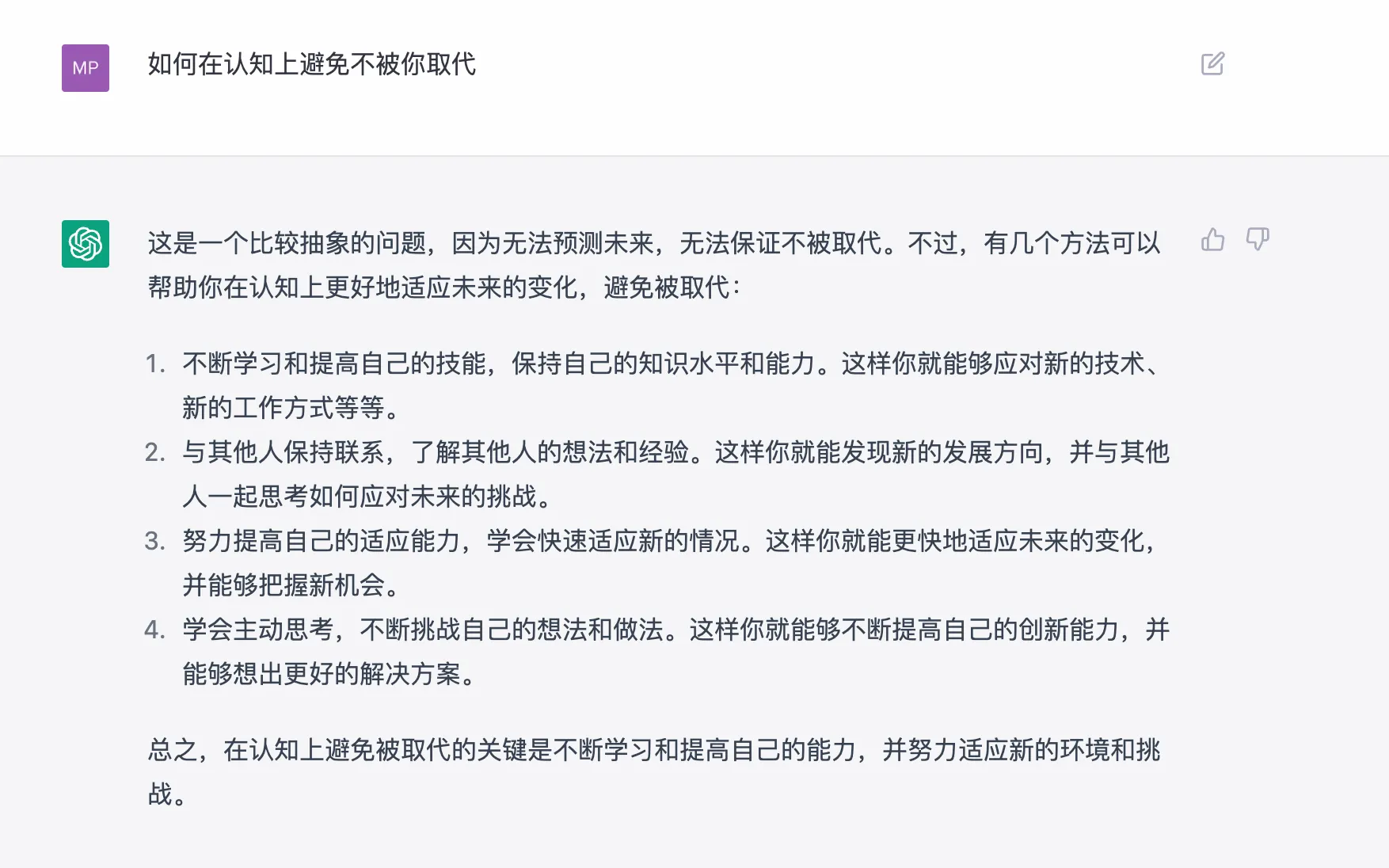 在某些方面强于普通人的,特别是对于重复性智力劳动,如重复性写套话、写代码、画图,那么怎么不被取代?还是需多学习、多主动思考、多实践、看更多书,做更多有挑战的事情,在认知上避免被取代的关键是不断学习和提高自己的能力,并努力适应新的环境和挑战。
