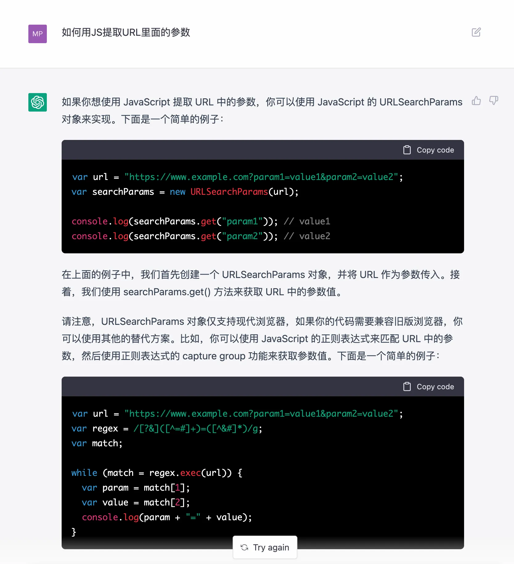 ChatGPT 除去内容能力外,对于简单的「编程」能力其实也不在话下,比如说如下这个很常用的提取 URL 用 JS 来实现的题目,写出来还是很不错的,其实 #OpenAI 还提供「Codex JavaScript Sandbox」这个比问答类的更好玩,可以将你一步一步的想法通过代码帮你来实现,比如说我让他画一个猫