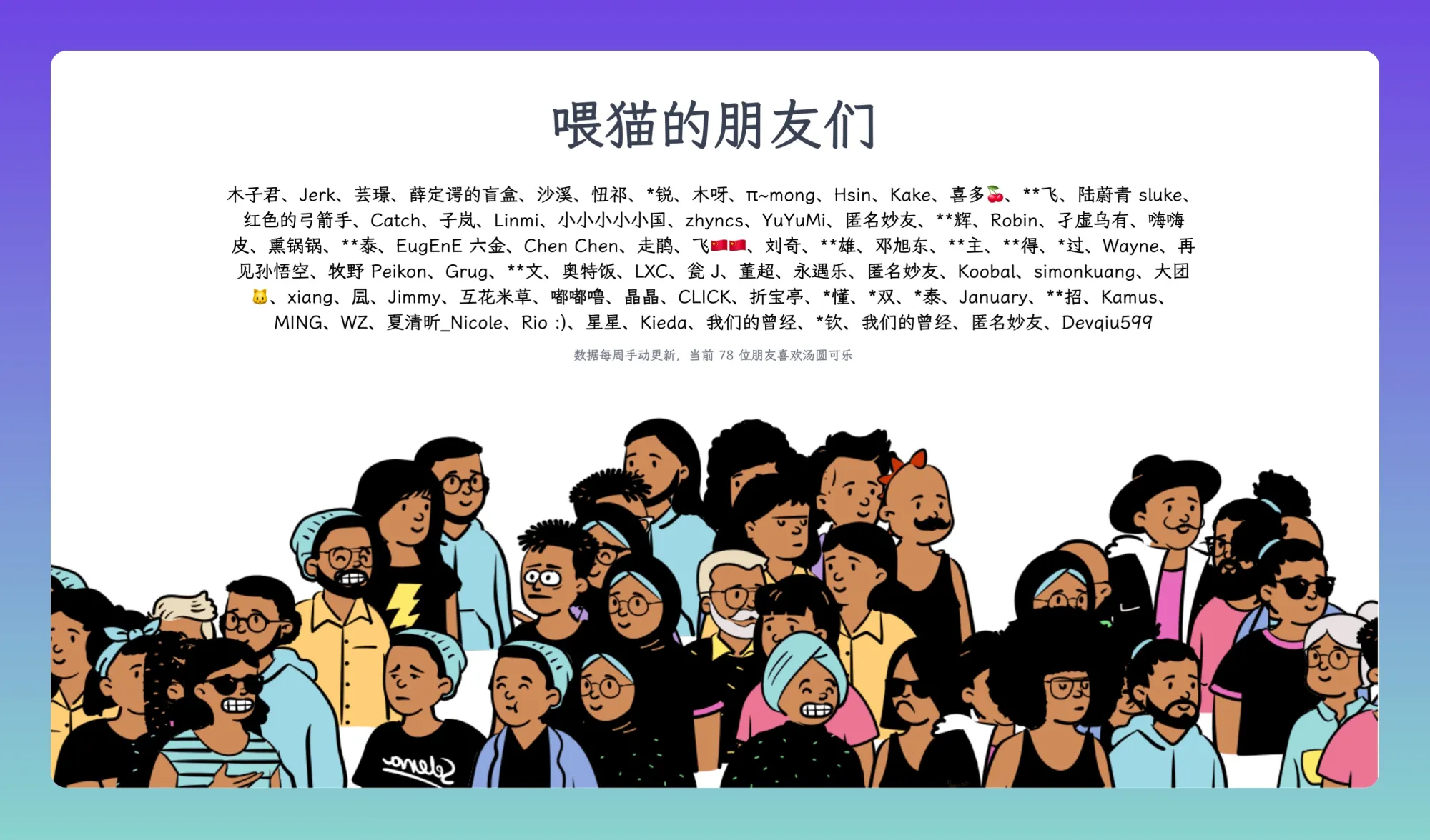 由于产品都是开源免费使用,想着做个有趣的连接,搞了个「给汤圆可乐喂罐头」页面,下半年开始家里两只猫吃的猫粮、罐头、用的机器、猫砂等基本上不需要额外操心,全部被云养猫的朋友们给包了,由衷的感谢。