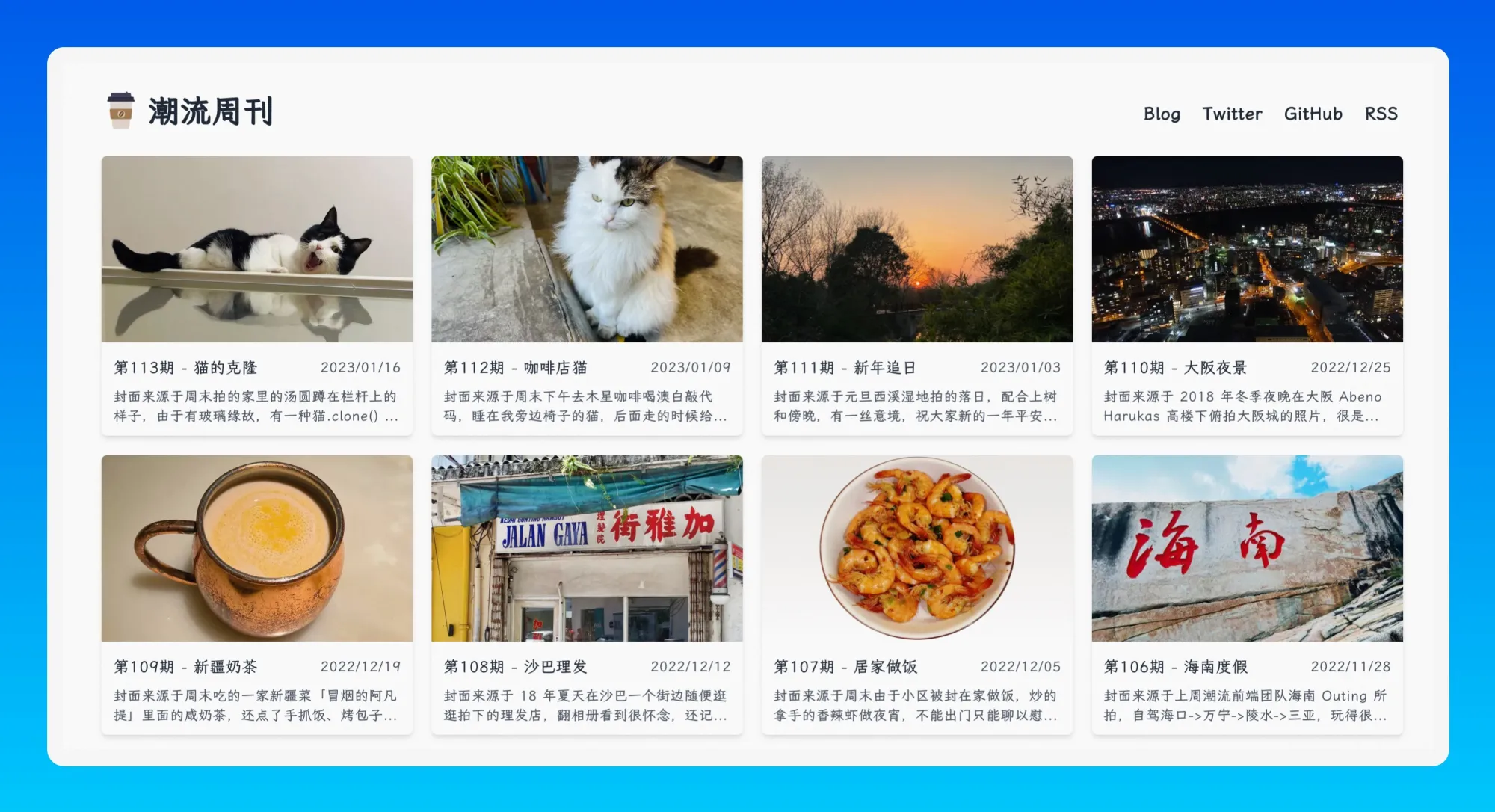 还有一个是潮流周刊,属于我每周学习整理,基本上每周天会花一下午时间来做这个事情,发现新东西,玩玩新技术,2 年前发布在内网语雀上面,后面有一些离职的朋友问有没有对外的版本,于是周末用 Astro 折腾了一个对外的版本,今年发布了快 50 多期的样子,也是很有趣的,更像是我的一个特殊的朋友圈。