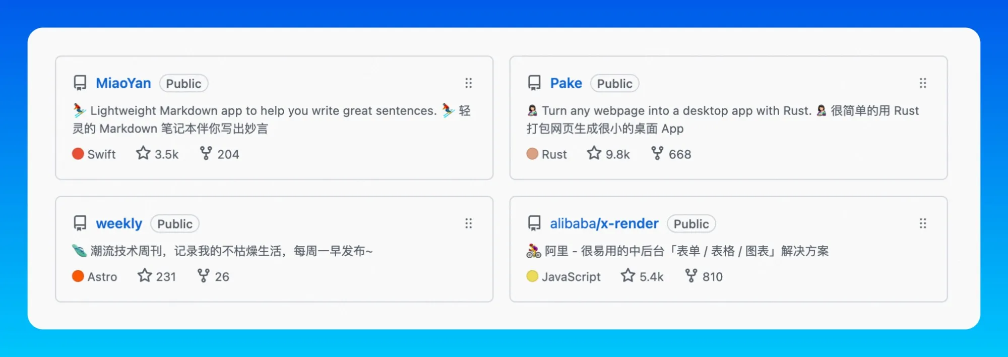 今年开源了 3 个作品,一个 妙言,另一个 10 月份开源了 Pake,这两个作品有很多朋友喜欢,也有投资人感兴趣,神奇的经历,此外Pake 居然成为了 2022 年创建的 Rust 项目中的第一名,通过开源也认识到了不少朋友,有湖南老乡,有设计师朋友,还有台湾的小伙伴,一起水群交流不少,还很地道的帮忙准备英文版本,很是不错。
