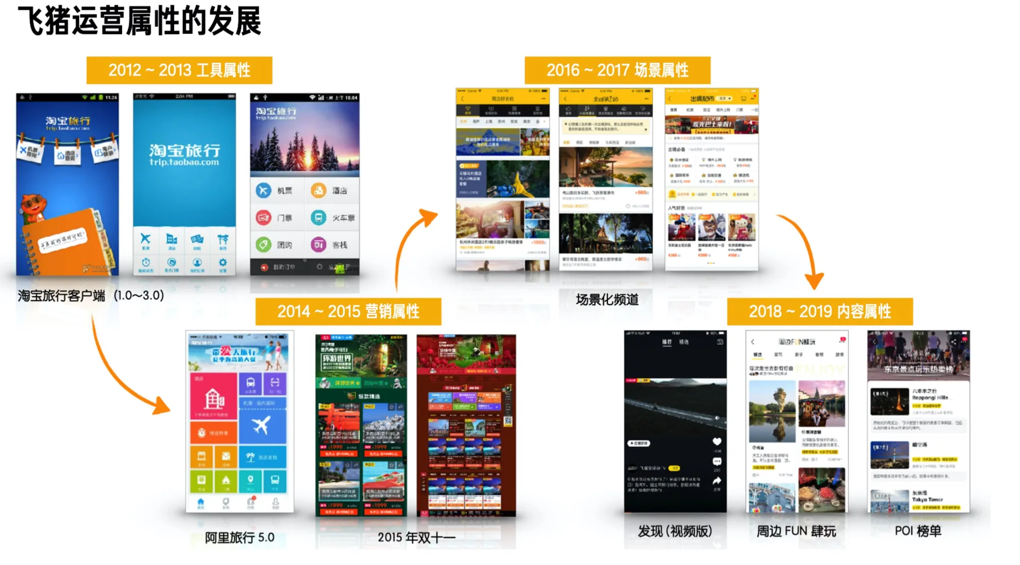In 2012, during the process of Alibaba ALLIN Wireless, Fliggy App also came into being at that time, equivalent to tool attributes, used for users to quickly query ticket information; by around 2014, tool attributes gradually enriched, and with the popularity of Double Eleven, it slowly transformed into a marketing and selling attribute, and various marketing platforms slowly grew up at that time;