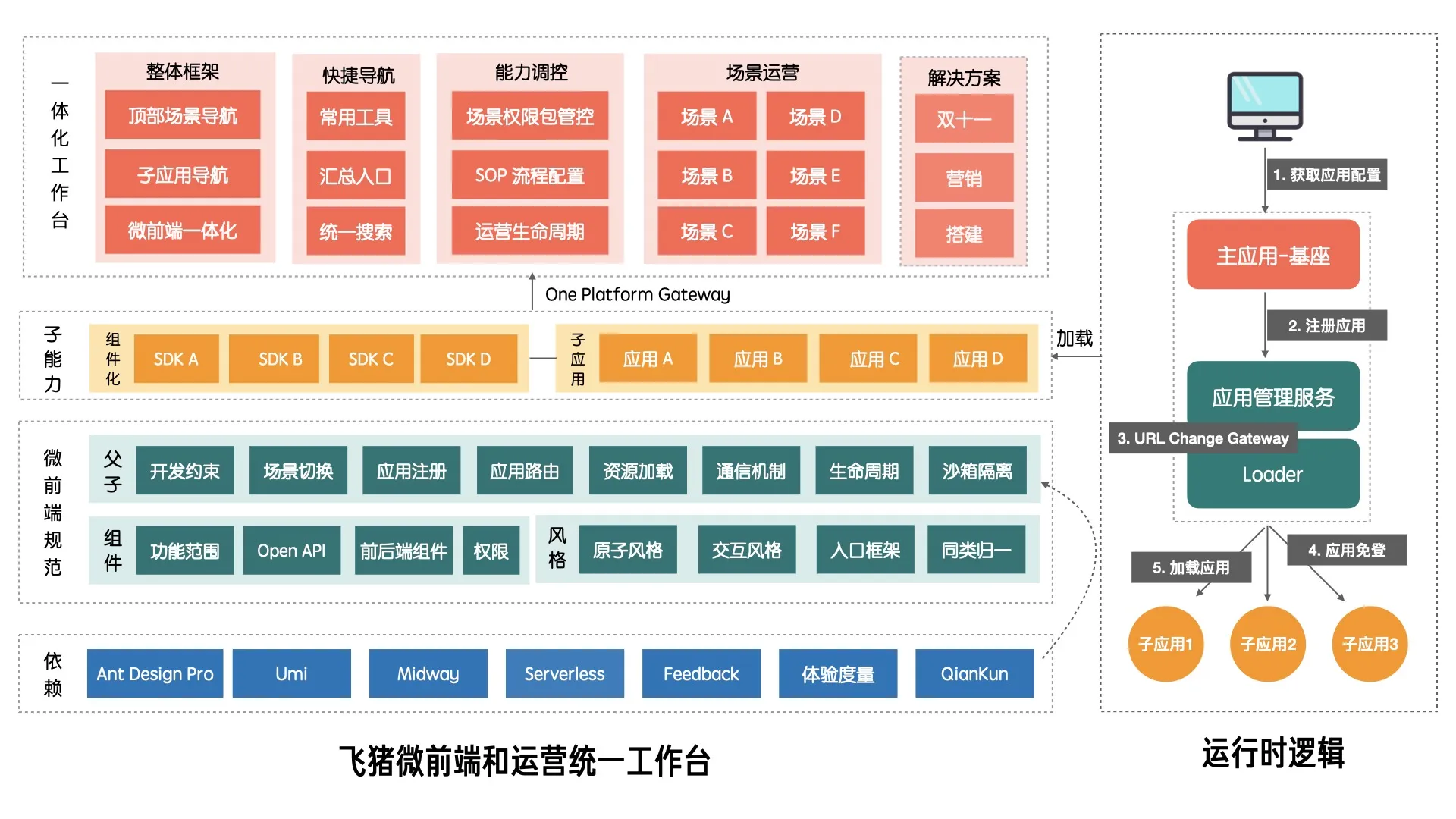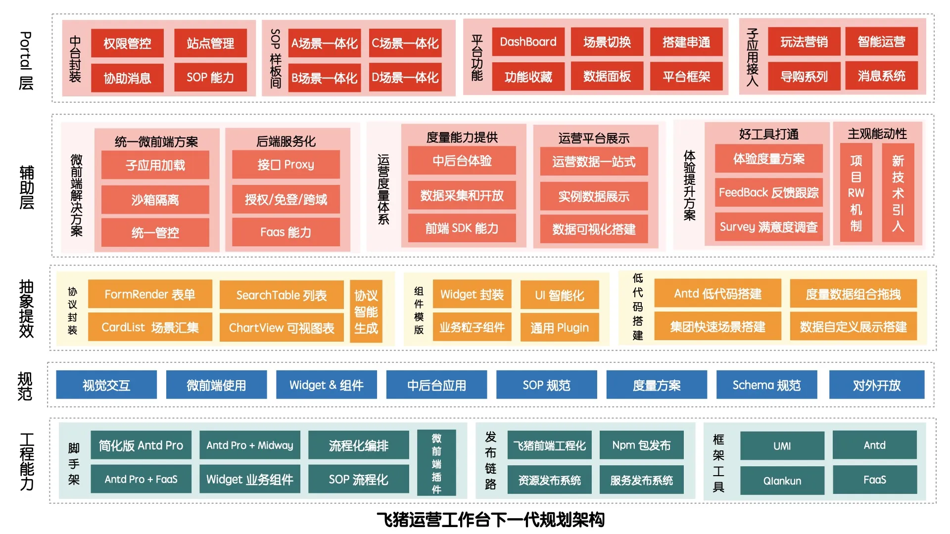 The bottom layer relies on the Ant Design system plus qiankun capabilities, the middle layer assists the specifications fitting existing business scenarios involved in the integrated workbench; the upper layer precipitates componentized widget capabilities for intercommunication of various functions, and at the same time becomes the combination source of existing sub-applications; at the top layer is the upper main application of Fliggy Operation Workbench, including the overall framework, quick navigation, permission login control, collection of operation scenarios, including the business operation SOP solution to be done later.