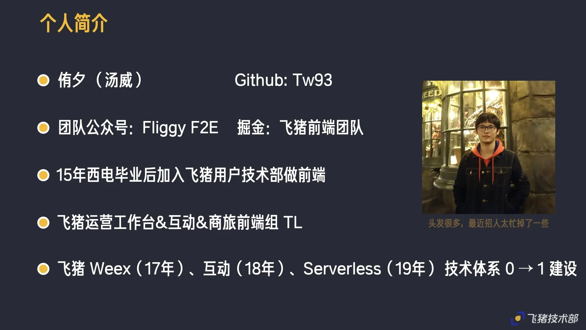 Hello everyone, I am Fliggy frontend Youxi. The theme shared today is “How to implement Micro Front-end Integrated Operation Workbench”. First of all, briefly introduce myself. My nickname is Youxi, and my external network id is Tw93. Currently, I spend part of my time on Fliggy frontend technical external influence, operating the Fliggy frontend team’s official account Fliggy F2E and Juejin Column, taking this opportunity to introduce some Fliggy frontend systematic construction to everyone.